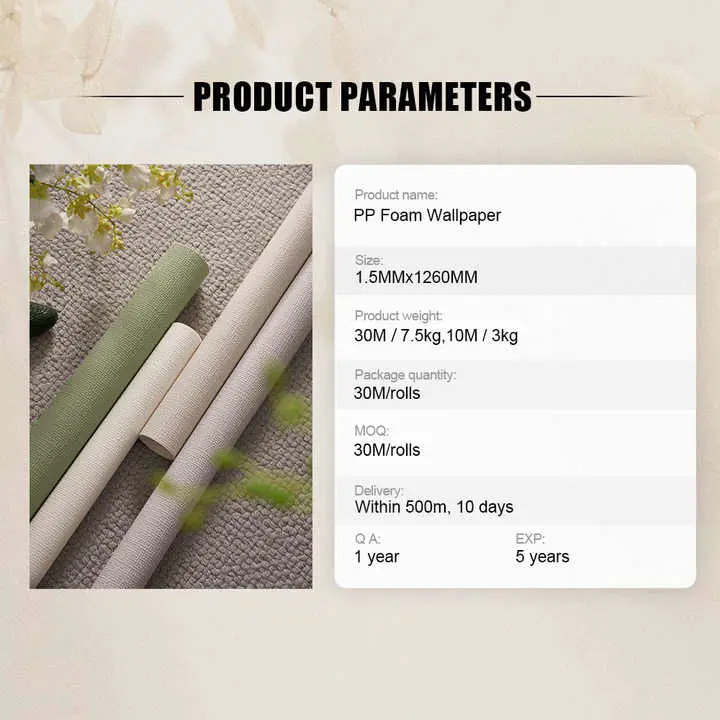 · நீடித்த மற்றும் நீர்-எதிர்ப்பு பொருள்: எங்கள் பிபி நுரை வால்பேப்பர் உயர்தர பாலிப்ரொப்பிலீன் பொருளிலிருந்து தயாரிக்கப்படுகிறது, இது ஈரப்பதம்-ஆதாரம், நீர்ப்புகா மற்றும் அச்சு மற்றும் வெப்பத்தை எதிர்க்கும் என்பதை உறுதிசெய்கிறது, இது வீட்டு, வர்த்தக மற்றும் நிர்வாக இடங்கள் உள்ளிட்ட பல்வேறு சூழல்களில் பயன்படுத்த சரியானதாக அமைகிறது.